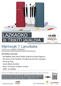 Aurten ere Lazkoko “Lazkao Txiki Musika Eskolan” trikitixa jaialdia antolatu dute, lehen aldiz, Lazkaoko Areria zineman izango delarik. NON: Lazkaoko Areria Zinema Aretoan NOIZ: Martxoak 7, larunbata ORDUA: 12:00tan Partaideak: Iker Makibar, Itziar Iraeta,…
