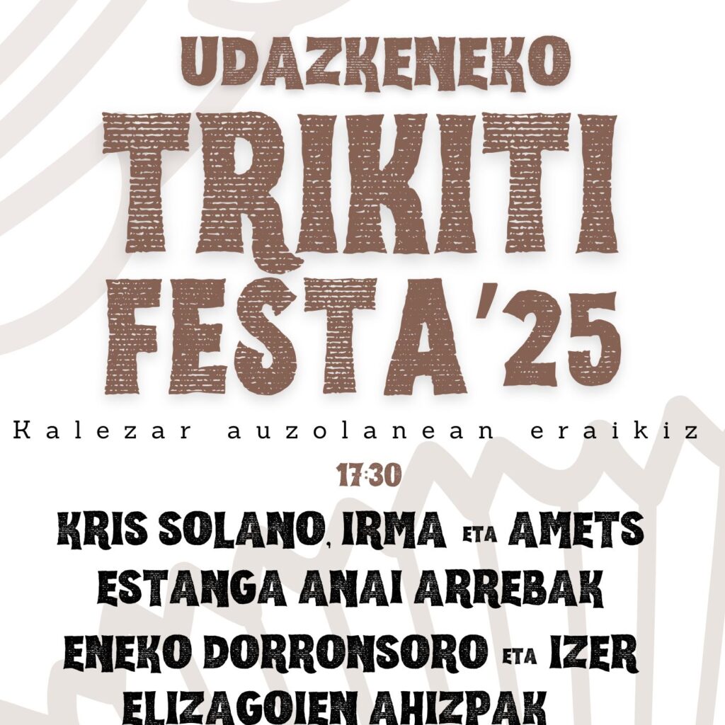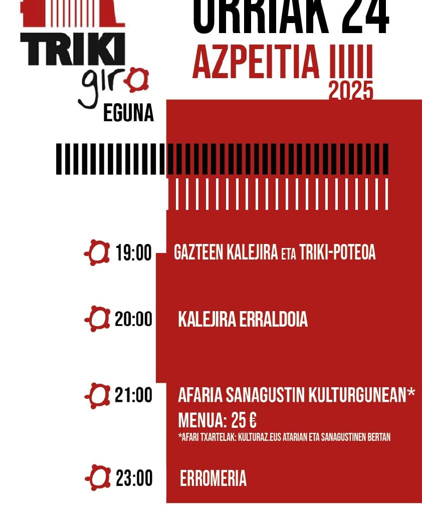 Urola erdiko Trikigiro Kultur Elkarteak, Triki Giro Eguna 2025 ondu du datorren urriaren 24rako. EGITARAUA: 19:00: Gazteen kalejira eta Triki-poteoa 20:00: Kalejira erraldoia…