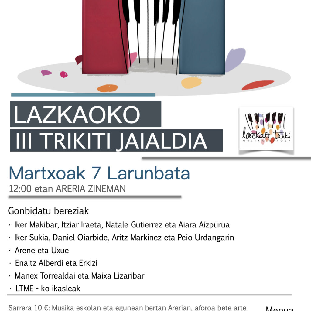 Aurten ere Lazkoko “Lazkao Txiki Musika Eskolan” trikitixa jaialdia antolatu dute, lehen aldiz, Lazkaoko Areria zineman izango delarik. NON: Lazkaoko Areria Zinema Aretoan NOIZ: Martxoak…