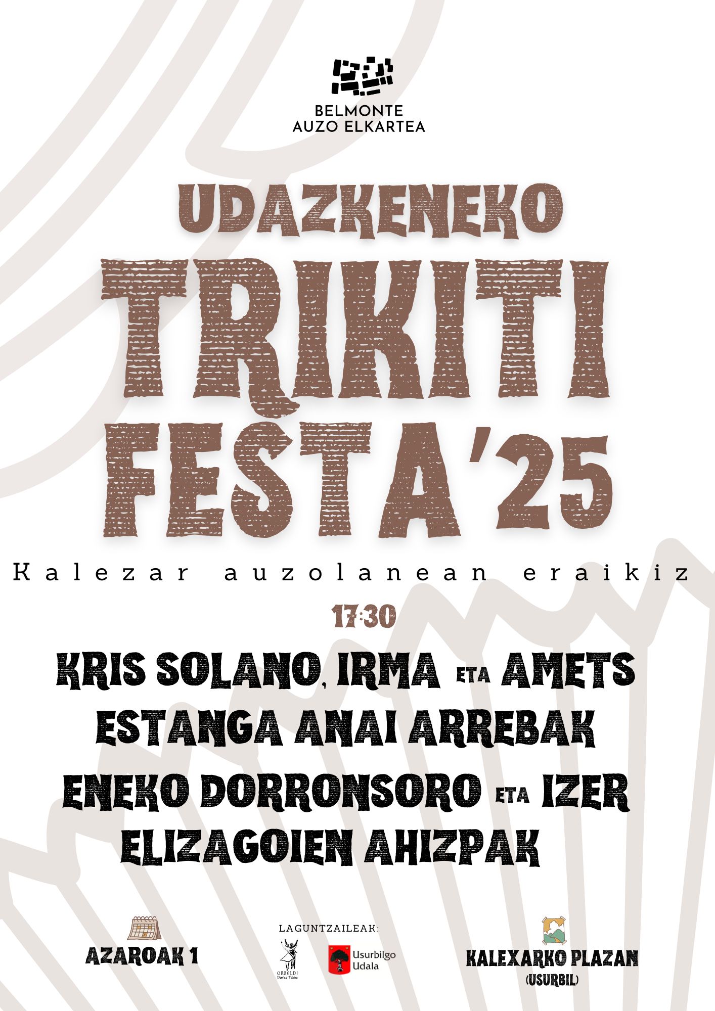 UDAZKENEKO TRIKITI FESTA – KALEXAR Informazio gehiago HEMEN + Google Egutegira gehitu + iCal / Outlook export 00 egun 00 ordu 00 minutu 00 segundu Data Aza 01 2025 Ordua 17:30 - 19:30 Kokalekua Usurbil Ekitaldi hau partekatu