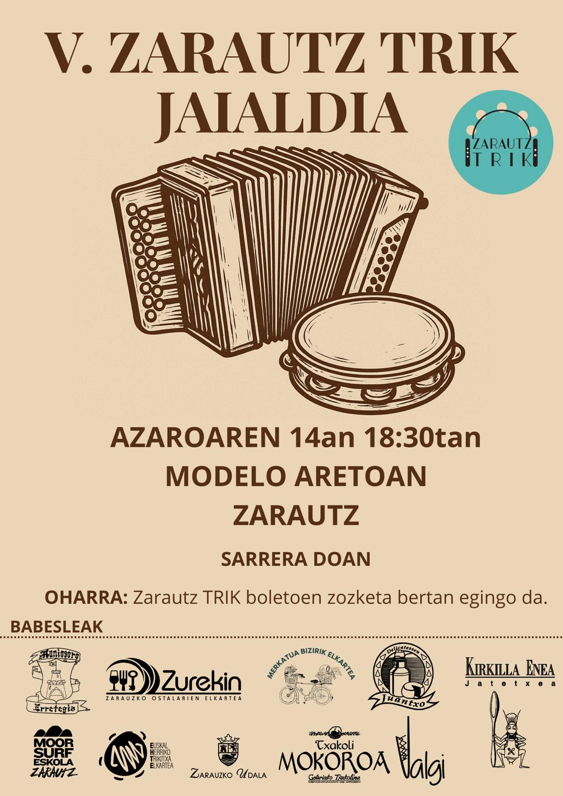V. ZARAUTZ TRIK JAIALDIA Informazio guztia HEMEN + Google Egutegira gehitu + iCal / Outlook export 00 egun 00 ordu 00 minutu 00 segundu Data Aza 14 2025 Ordua 18:30 - 20:30 Kokalekua Zarautz Ekitaldi hau partekatu